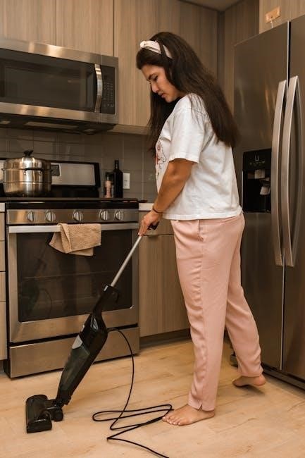 To maintain your Oster microwave oven, start by cleaning the interior with a water-vinegar solution using a soft cloth․ For tougher stains, use a microwave-safe scrubber gently․ Avoid harsh chemicals and abrasive cleaners to prevent damage․ Wipe down the exterior with a mild soap solution, ensuring no moisture enters vents․ Clean the turntable and accessories with mild soap and water․ Regular cleaning prevents grime buildup and ensures optimal performance․ Dry all surfaces thoroughly with a microfiber cloth to avoid water spots․ This routine keeps your microwave hygienic and functioning efficiently․